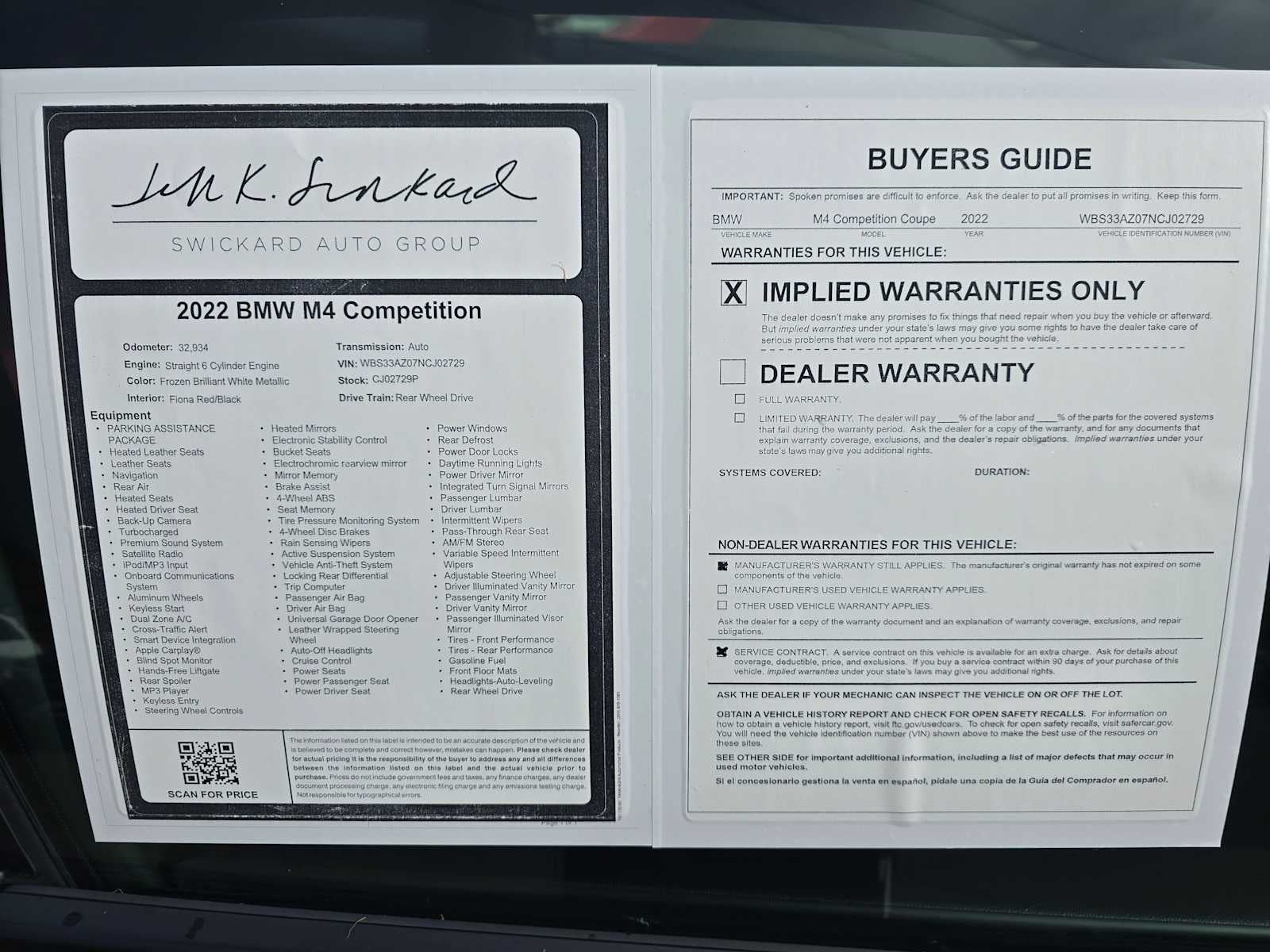 Step into the exhilarating world of the 2022 BMW M4 Competition Coupe, where high-performance engineering meets the laid-back luxury of Northern Californias vibrant lifestyle. As you settle into the sumptuous leather seats, the cabin envelops you in an atmosphere of sophistication, setting the stage for an unforgettable driving experience. The Parking Assistance Package enhances your urban experience, with smart features that guide you effortlessly through bustling streets and into snug parking spots, allowing you to focus on the vibrant life around you. The advanced navigation system guides you effortlessly to your next destination, while the heated driver seat wraps you in warmth, making every drive a pleasure, regardless of the weather. With rear air ensuring comfort for all passengers, this coupe is designed for those who appreciate the finer things in life. The Drive Recorder captures every thrilling moment, allowing you to relive your adventures on the road. The M4 Competition Coupe is not just a car; its a statement of power, performance, and luxury, crafted for those who demand excellence. Ready to elevate your driving experience? Visit us today and let the BMW M4 Competition Coupe take you on a journey where every mile is a celebration of driving pleasure.According to CARFAXs Vehicle History Report, this car had only one previous owner!!