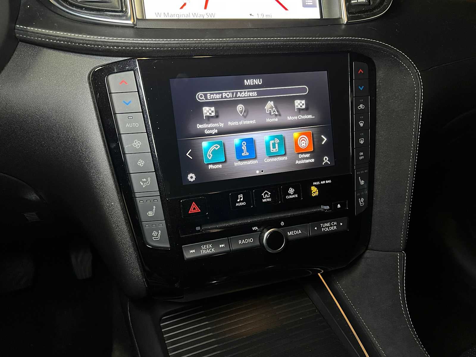 - Radio: Bose Performance Series Audio System -inc: 16 speakers, metallic speaker grilles on tweeters, INFINITI InTouch, INFINITI InTouch services, INFINITI InTouch dual display system w/upper 8" and lower 7" HD touch screens, wireless Apple CarPlay, Android Auto, SiriusXM radio w/advanced audio features and 90-day complimentary trial, INFINITI voice recognition, Siri Eyes Free, Wi-Fi hotspot, active noise cancellation, navigation w/3D building graphics, 5 year complimentary access to premium traffic and MapCare, SiriusXM Traffic w/3 month complimentary trial access to real-time traffic information and SiriusXM Travel Link w/3 month complimentary trial access to weather, fuel prices, stock prices, sport scores, movie listings and parking