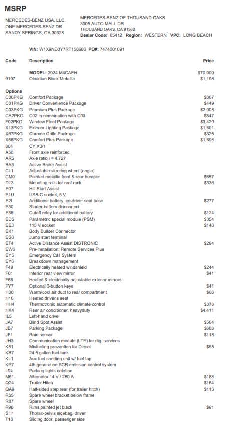 HEAVY-DUTY REAR AIR CONDITIONER, WINDOWS ALL AROUND PACKAGE: Rear Laminated Glass, Center Left Fixed Window, Panel Van w/Windows All Round, Rear Window Defroster, Center Right Fixed Window, Passenger Side 2nd Row Fixed Window, Rear Right Fixed Window, Storage Compartment w/Net in Rear Doors, Rear Left Fixed Window, PREMIUM PLUS PACKAGE: Instrument Panel Front-to-Rear Outlet, Traffic Sign Assist, Tray for Smartphones w/Wireless Charging, Free Map Data Updates for 3 Years, Navigation, Acoustic Package, Intelligent Navigation, Radio: MBUX Multimedia System w/10.25 Touchscreen, AM/FM radio w/dual tuner, Bluetooth® connectivity w/audio streaming, improved hands-free functionality, smartphone integration via Android Auto® or Apple CarPlay®, multimedia interface, 2 USB-C port, center fill loudspeaker for an improved sound quality and voice output, hard disc navigation including free map updates for 3 years, Mercedes me connect, LINGUATRONIC voice control and WLAN-hotspot, COMFORT PLUS PACKAGE: Heated Front Passenger Seat, Electrically Adjustable Front Passenger Seat, Electrically Adjustable Drivers Seat, EXTERIOR LIGHTING PACKAGE: Partial LED Tail Lights, High Beam Assist, LED High Performance Headlamps, Fog Lamp w/Cornering Light Function, ELECTRIC SLIDING STEP, OBSIDIAN BLACK METALLIC, ROOF TRIM, ELECTRIC SLIDING DOOR RIGHT, LUXURY INTERIOR TRIM, PARKING PACKAGE, PAINTED METALLIC FRONT & REAR BUMPERS, C02 IN COMBINATION W/C03: Leather Steering Wheel, Wet Wiper System, Active Lane Keeping Assist, BLIND SPOT ASSIST, DRIVER CONVENIENCE PACKAGE: Hinged Lid For Left & Right Storage Compartments, ATTENTION ASSIST®, 2 Additional Master Keys, Hinged Lid for Storage Compartment, Driver Seat Base 12V Power Outlet, PLASTIC FLOOR COVERING, THERMOTRONIC AUTOMATIC CLIMATE CONTROL, HEATED REAR WINDOWS W/WASHERS & WIPERS, PARAMETRIC SPECIAL MODULE (PSM), ROOF RACK MOUNTING RAILS, CHROME GRILLE PACKAGE: Radiator Grille Frame in Vehicle Color, Chrome Plated Radiator Grille, ACTIVE DISTANCE ASSIST DISTRONIC®, ADDITIONAL BATTERY, CO-DRIVER SEAT BASE: Additional Battery Cutoff Relay, ELECTRICALLY HEATED WINDSHIELD,Back-Up Camera, Diesel Mercedes-Benz of Thousand Oaks is your local Mercedes-Benz dealership, serving the Thousand Oaks and Los Angeles Metro area since 1982. Our showroom always includes the most current luxurious and sophisticated Mercedes-Benz models. Were only a short trip from many communities, including Malibu and Simi Valley, and our team is happy to provide sales, financing, and automotive service and repair on site.